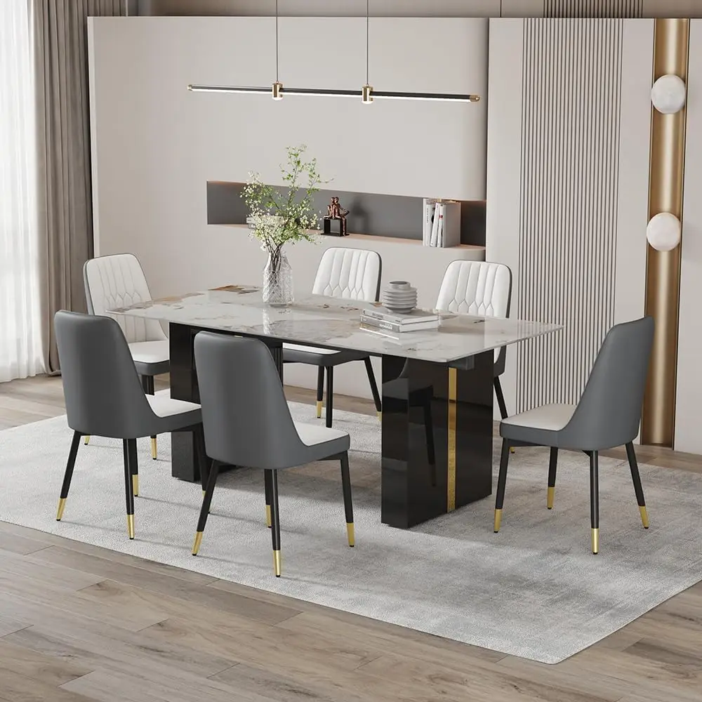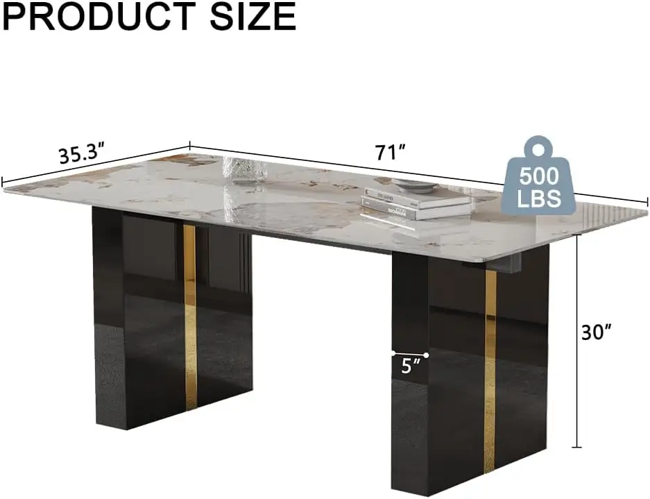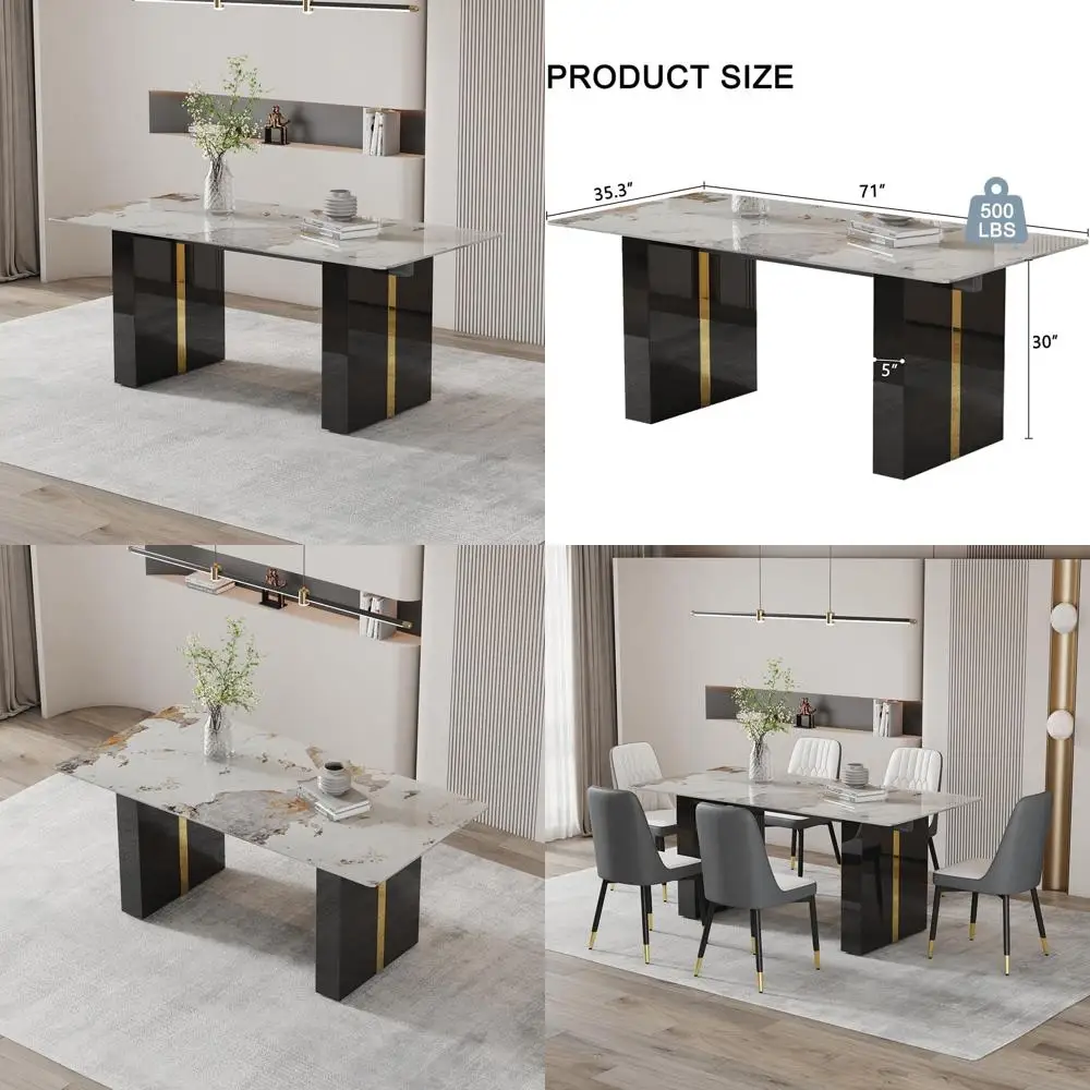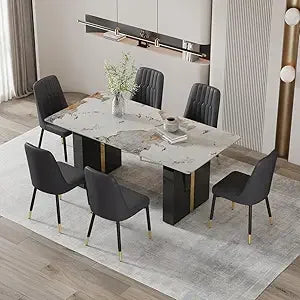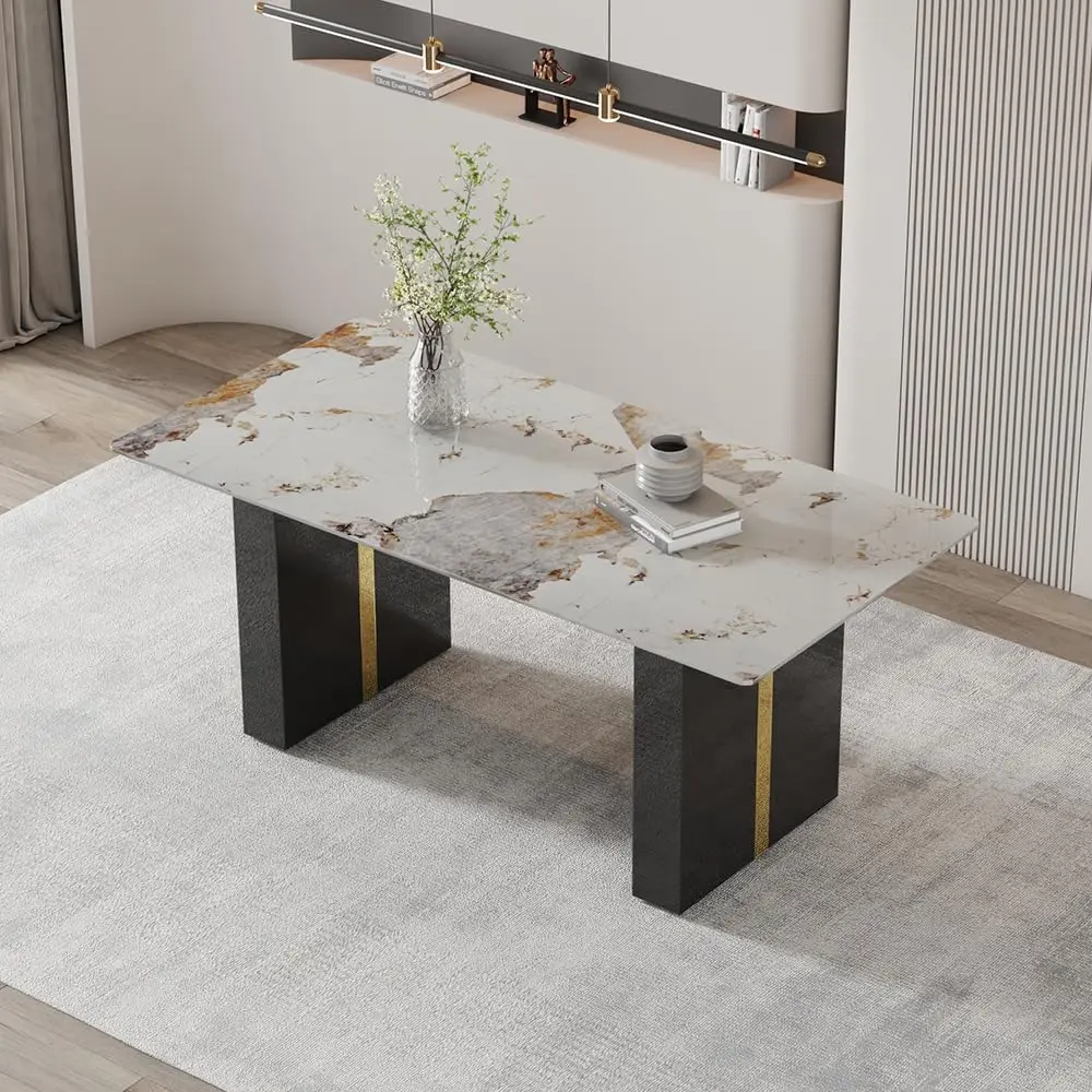 Discover the sleek and modern PDLB dining table, a perfect blend of minimalist design and functionality. Its streamlined silhouette and clean lines infuse any dining space with a touch of contemporary flair, making it versatile enough to complement various interior styles. Crafted with premium materials, this table boasts a durable faux marble glass top and sturdy MDF legs finished in black and gold, ensuring both strength and stability. Enjoy the peace of mind that comes with safe, non-toxic construction, suitable for direct contact with food, and the ease of assembly with detailed instructions included. This adaptable table is designed to seat 6-8 people, making it ideal for work, social gatherings, or family meals. Its contemporary design effortlessly complements any decor. We are committed to your satisfaction, offering a 100% guarantee. Should you receive a damaged or defective item, simply provide photos, and we will quickly facilitate a replacement. Our customer service is dedicated to addressing your concerns with prompt responses and expert advice, ensuring your experience exceeds expectations.